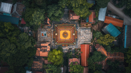 This serene aerial view showcases a colorful temple surrounded by lush greenery, emphasizing the harmony between architecture and nature in a peaceful setting.