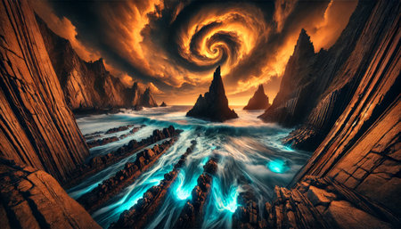 Vibrant landscape of the sea at dusk with dramatic contrasts in colors