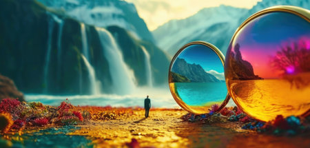Reflection of a man in a mirror ball on the background of a beautiful waterfall