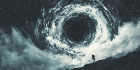 A man in the snowy north looking at a black hole in the sky. Generative AI image