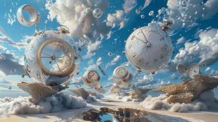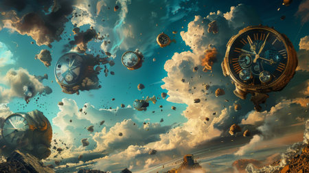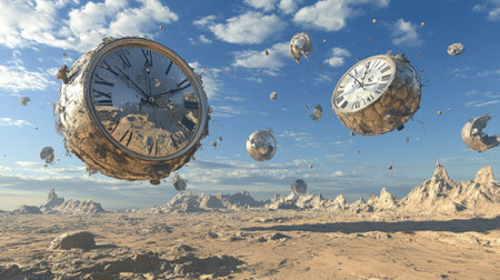 Explore a captivating surreal landscape featuring floating clocks in a deserted terrain, evoking a sense of time and imagination under a vast sky.