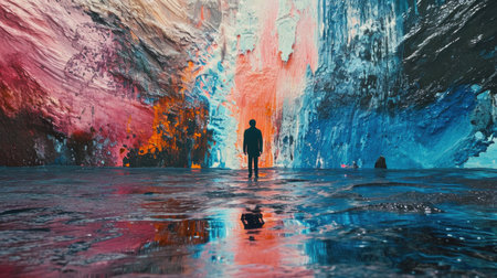 Artist gazing at large abstract painting in studio. Vivid colors and dramatic textures create immersive atmosphere. Concept of creativity, artistic expression, art studios.