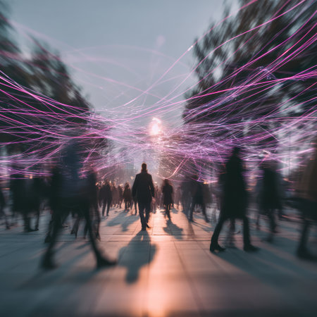 A group of people are seen blurred, walking along a pathway, with streaks of purple lines overhead. The image employs shallow depth of field, with soft focus on the individuals. The overall style is modern and digital, suggesting a sense of movement. Suitable for projects related to technology, connectivity, or urban life.