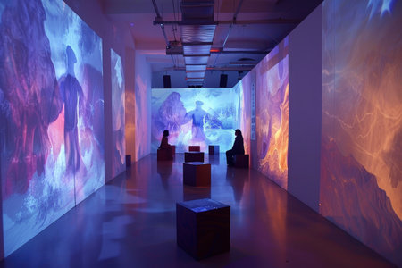 Visitor silhouetted against sharp colorful moving imagery covering walls floor projections faintly visible beneath with softly diffused crowd activity in the background.