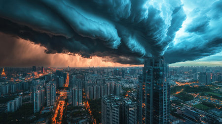 A thunderstorm approaching, its dark clouds reflected in the glass windows of a high-rise.