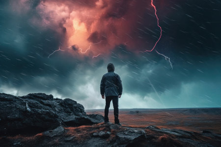 Man standing on the top of a mountain and watching the storm. Against storm in a distant cloud, in Cinematic style, Generative Ai