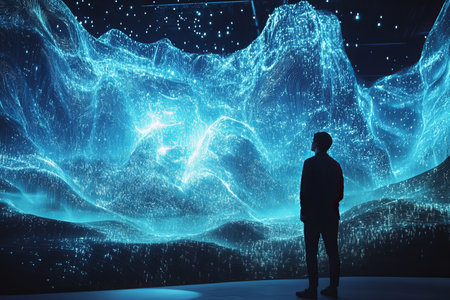 Illuminated digital landscape showcasing advanced technology and human interaction in the future