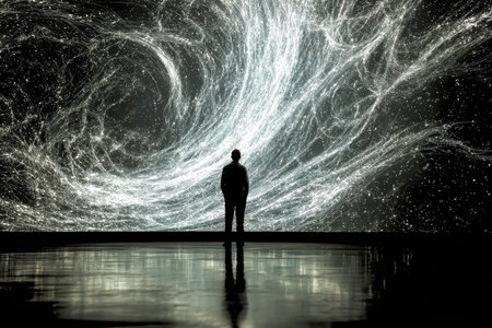 A solitary individual gazes upward, surrounded by vibrant spirals of celestial hues, immersed in deep reflection amid the mesmerizing chaos of cosmic brilliance.