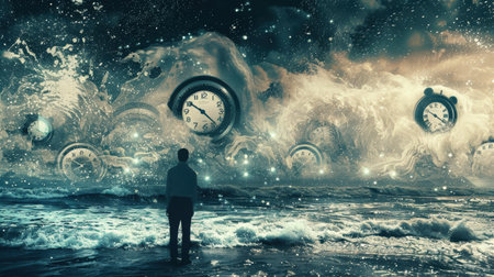 A painting depicts a large clock face melting into waves. The vibrant scene features a sunset or sunrise sky, with dramatic clouds. The artwork suggests concepts of time, change, and fluidity. Its visual characteristics make it suitable for a variety of editorial and commercial applications.