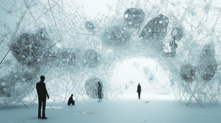 An intriguing abstract scene depicting figures navigating through a complex digital network. This imaginative space showcases an ethereal interplay of light and geometry, creating a modern, surreal atmosphere.