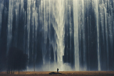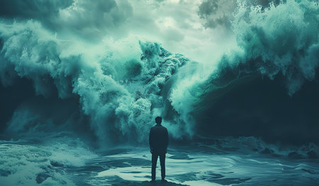 A man stands fearlessly in front of a massive wave, showing the power and size of the ocean. The wave looms behind him, emphasizing the contrast between human vulnerability and natures might.