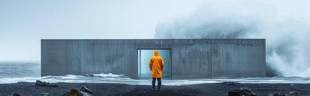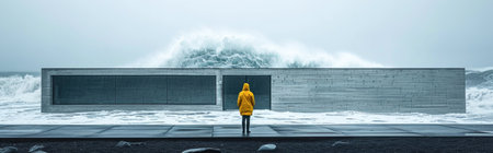 A man in a yellow raincoat stands in front of a large wall with a big wave on it