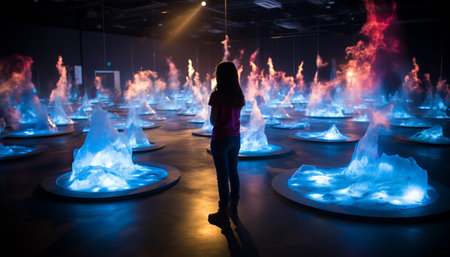 An individual stands captivated amidst swirling neon hues and geometric projections, immersed in a cutting-edge, immersive technological showcase.