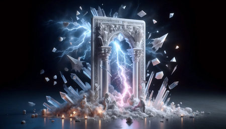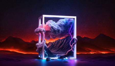 Futuristic portal with lightning in a surreal landscape