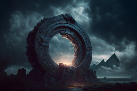 Thunderstorm round portal gateway to another world. Clouds in sky above gate, a glowing passage through the arch.