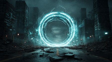 Dark city street with glowing blue portal, surrounded by skyscrapers and rubble at night