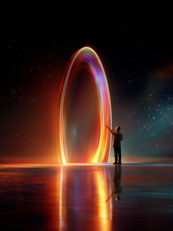 Person pointing at tall glowing oval portal in cosmic environment. Concept of sci-fi digital collage, AI-augmented visual elements, metaverse background creation, and future-tech scene building.
