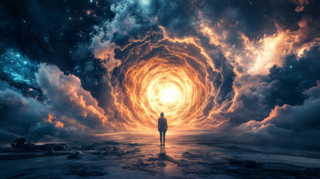 Person silhouette on the top of a dune in a desert looking at the mysterious phenomena in the sky. Surreal scene with a cosmic nebula swirling through the dense clouds. Fantastic and magical landscape