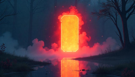 Neon portal reflected on lake in forest at night