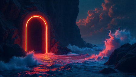 Neon portal on ocean cliffs with crashing waves at dusk