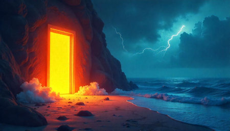 Dramatic coastal landscape with glowing doorway and lightning storm