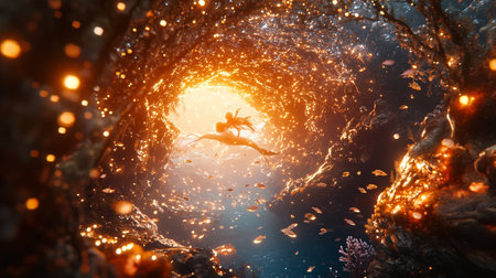 Underwater view of man swimming in underwater cave. 3D rendering