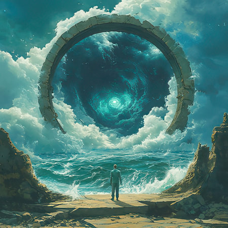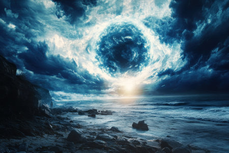 Mysterious portal on beach at dusk with stormy sky