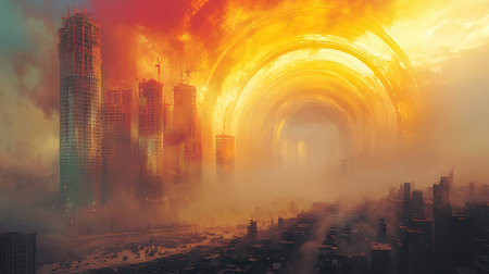 Surreal alien cityscape by the beach featuring towering structures and a spiral portal in the sky