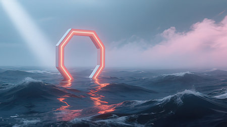 View of the calm sea in the evening, a neon frame emerging from the water, futuristic background