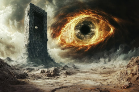 A towering structure stands tall in a barren landscape, dominated by a giant glowing eye and dark clouds.