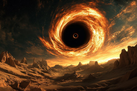 A dramatic cosmic landscape shows a brilliant black hole at the center, surrounded by fiery gases and rocky terrain.