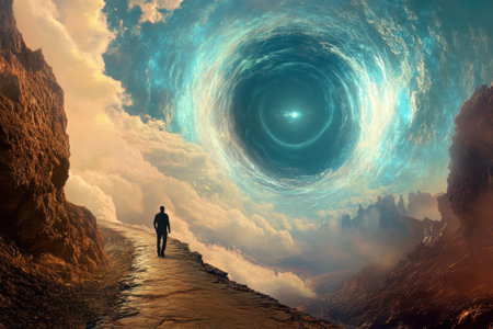 A lone figure walks on a winding path surrounded by mountains, approaching a swirling portal in the sky.