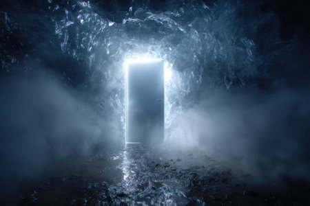 A door stands ajar in a dark cave, surrounded by fog and shimmering light. The atmosphere is tense and inviting.