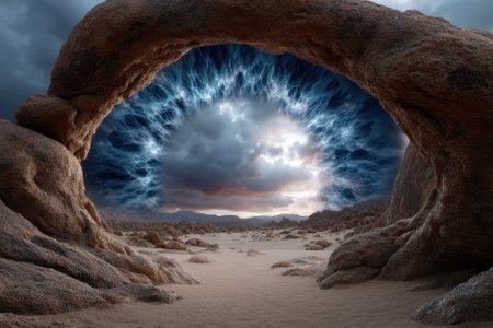 A stunning cosmic portal appears within rocky arches in a desert landscape, illuminated by vibrant clouds.