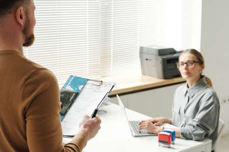 Horizontal shot of unrecognizable man holding set of documents for travel visa application entering office and greeting specialist