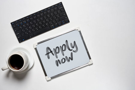 Apply now . Desk with apply now and computer, cup of coffee on white backgraund . Work space