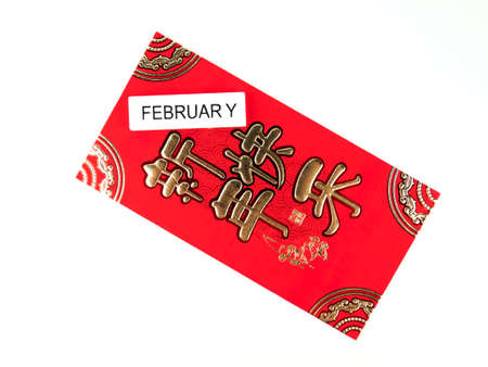 Red envelope isolated on white background with February for gift Chinese New Year. Chinese text on envelope meaning Happy Chinese New Year.