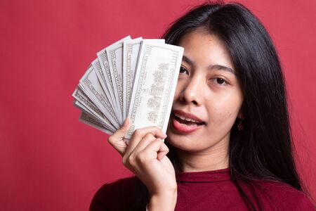 Portrait of young asian woman showing bunch of money banknotes on red background.