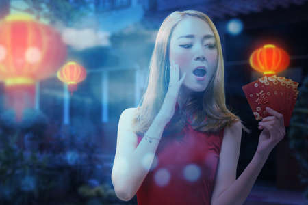 Asian Chinese woman in a cheongsam dress holding red envelopes. Happy Chinese New Year