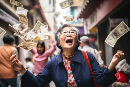 Happy person getting bonus money and banknotes flying in the air and get lucky rich and financial freedom comeliness