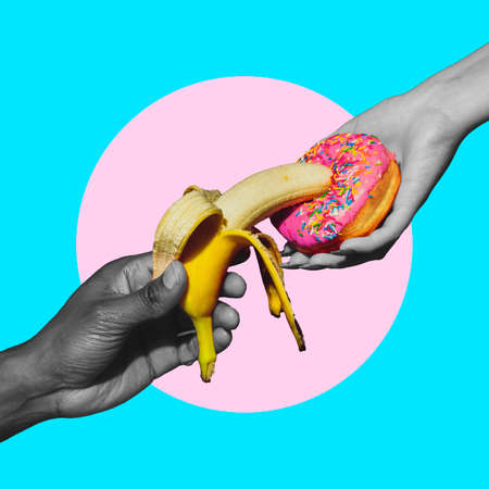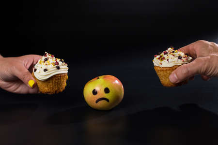 diet concept, overweight by confinement, choosing between fruit or industrial pastries, healthy diet