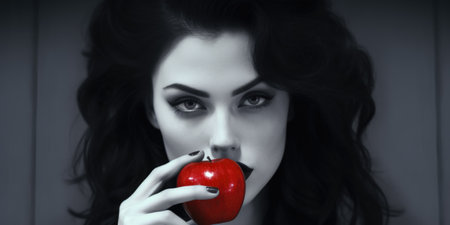 Witch woman in black offers red apple as symbol of temptation, poison. Fairy tale, white snow wizard concept. Spooky halloween, cosplay.