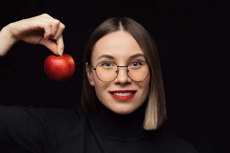 Close up smiling woman portrait wearing glasses with black frames, with red lips, looking at the camera while holding a red apple on black background.