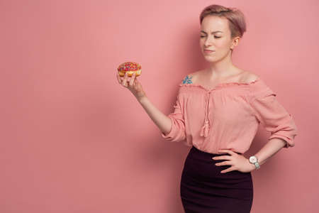 A girl with short pink hair, holds a donut in her hand, and grimaces at him, on a pink background.