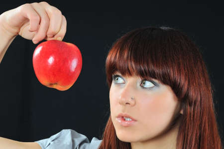 an attractive fit girl weighs her options of weather to eat chocolate or an apple. bad and good food.