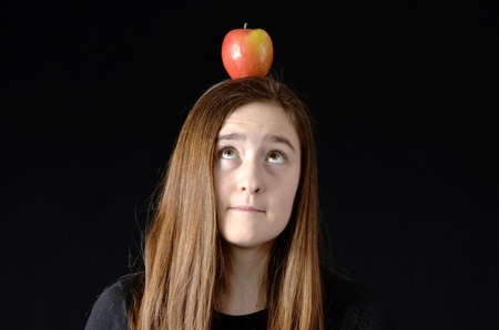 Teenaged girl looking up at apple on her head wearing black shirt on black background
