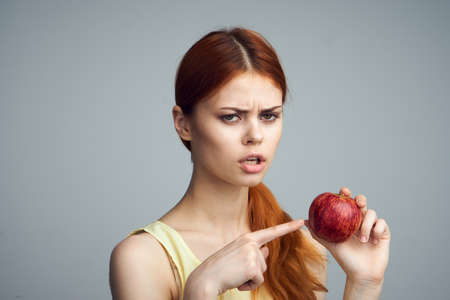 Diet, apple, healthy diet, slimming, girl holding an apple, health, beauty, girl on a gray background.