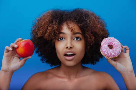 bright woman chooses donut or apple --ar 3:2 Job ID: fe8ce387-0af5-4700-83f2-d6c504720b36