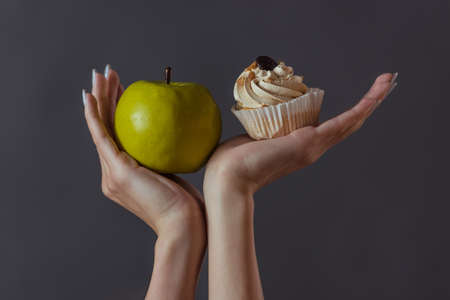 Cropped image of woman's hands holding an apple and a cake, on gray background
