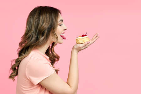 Profile portrait of young woman licking delicious pastry cake on pink background